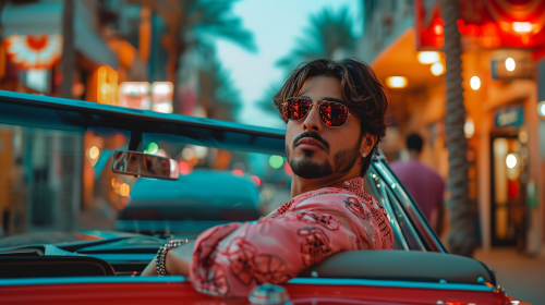 A 20 years old Arab rapper riding a red convertible with 1999 written on the license plate 8k