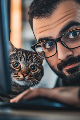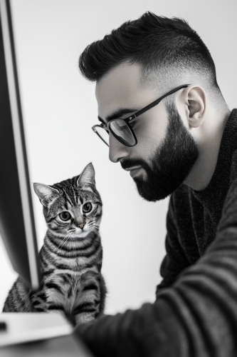 A lanky Arab man with a short haircut and beard. Sitting at a computer in a video meeting. View from a computer camera. A striped cat got into the frame right in front of the camera --s 50