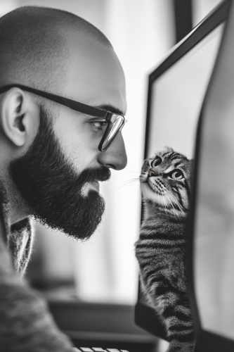 art, The sales manager, a male Arab with a short haircut and beard, wearing glasses in video meeting . He is sitting at a computer and next to him is a striped cat trying to get into the computer's camera , color imagery --ar 2:3 --s 50
