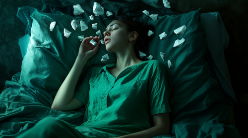 Woman sitting in bed at night in green sheets and holding her sore throat, sharp pieces of stones levitating around her neck, advertising quality, photo quality --ar 16:9 --v 6.1