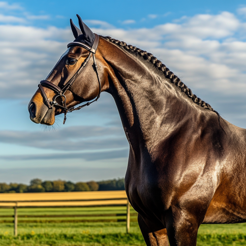 A majestic, well-groomed horse standing calmly in a serene countryside setting, ready for a dressage competition. The horse looks relaxed and focused, exuding a sense of calm confidence, with a sleek, shiny coat and neatly braided mane. The background features a picturesque English countryside with rolling green fields, a wooden fence, and a few distant trees. The sky above is clear with a mix of soft white clouds and a bright blue, creating a tranquil and peaceful atmosphere. The overall mood is one of composure and readiness, highlighting the effectiveness of the calming supplement.
