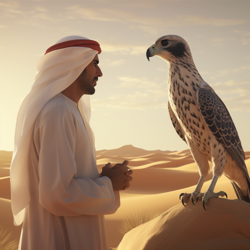 An Arabian falcon stands on the hand of an Arab man in the desert, 4K, cinematic mode, Excessive detail, cartoon--v 5.2