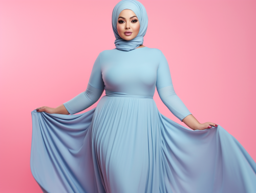 glamour photography, full body shot, arabic princess, chubby, bloomy, beautiful, vide hips, blue dress, isolated pink background, 8K --ar 4:3