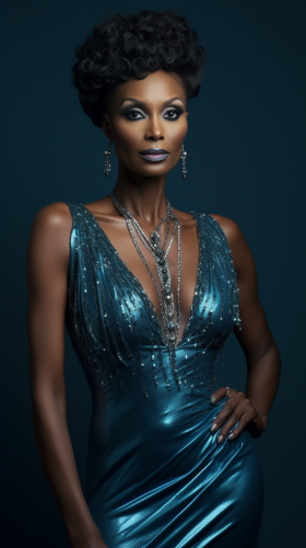 business portrait, beautiful thin black woman, 43 years old, wearing gorgeous dress, metallic blue, beautiful makeup, full body shot, --ar 9:16