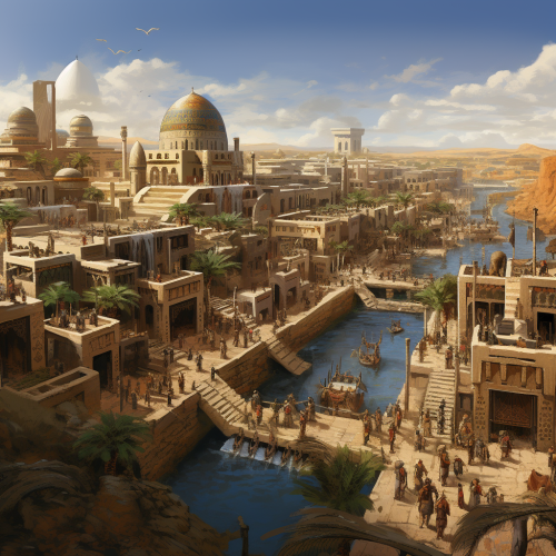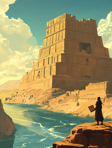 A vibrant archaeological scene depicting the ruins of ancient Mesopotamian cities like Ur and Nineveh at sunset, casting a warm golden light on the sandy terrain. In the foreground, several archaeologists in work attire are carefully excavating, using tools like shovels and brushes, focused on their task. Surrounding them are various clay tablets inscribed with cuneiform writing, alongside beautifully crafted ancient statues and artifacts, showcasing the artistry of the civilization. Partially visible is a grand temple ruin with towering stone columns and intricate carvings, hinting at its former glory. In the background, desert wildlife like camels and birds coexist with the ruins, symbolizing the natural environment. Above the scene, translucent images of ancient Mesopotamian life--farmers working the land, bustling marketplaces, and ritual ceremonies--create a dynamic contrast, emphasizing the intersection of history and discovery. The color palette features soft earth tones and warm hues of sunset, enhancing the atmosphere of exploration and reverence for the rich heritage of this ancient civilization --ar 16:9
