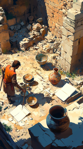 Illustrate an archaeological site in Crete, focusing on a scene where an archaeologist is carefully excavating ruins. Surround the archaeologist with various exquisite pottery, metal artifacts, and vivid fragments of frescoes that showcase the advanced craftsmanship and rich cultural heritage of the ancient civilization. Include archaeological tools and a notebook nearby to highlight the research process. In the background, depict some yet-to-be-excavated remains, hinting at the grandeur of the past, with golden sunlight filtering through, casting a warm glow on the ancient stones, creating a mysterious and historical atmosphere --ar 9:16