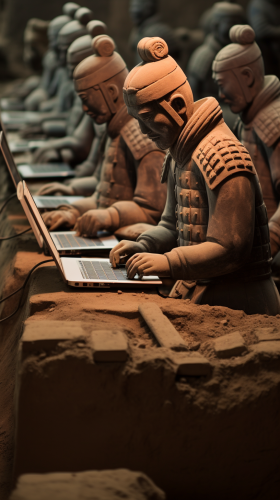 [29bbfaecf] Archaeologists were astonished to discover ancient terracotta warriors equipped with electronic computers at the archaeological site. --v 5.2 --ar 9:16 --c 0