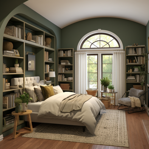 design a cozy, casual master bedroom with built in, arched bookcases painted sherwin williams pewter green 6208, hex code 5E6259, in nate berkus style with a small window 8k realistic, camera angle directly facing bookcases- --v 5.2