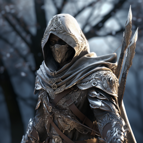 A female archer with long red braids and green eyes, wearing a combination of fur and leather armor, holding a bow, standing on a snow covered glade, snowing weather, fantasy style, dungeons and dragons style, high quality, --ar 16:9 --v 6.1