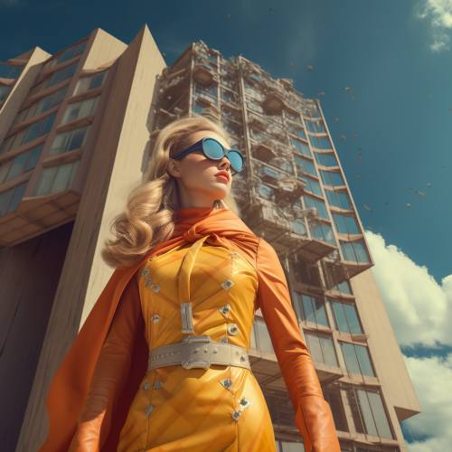 Female architect shot from behind, holding blueprints up to light, fitted safety vest and designer boots, modern building framework backdrop, sunrise lighting --ar 9:16 --style raw --s 250