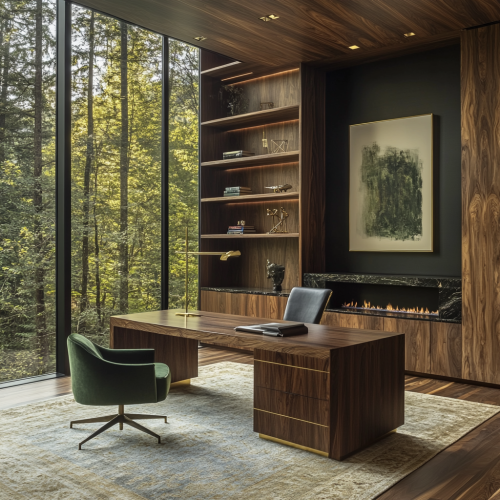 Create a private office that exudes luxury, modernity, and serenity, designed for both focus and relaxation. The office features one wall made entirely of glass, opening up to panoramic views of the surrounding forest canopy, allowing natural light to flood the space during the day while maintaining a sense of seclusion. The centerpiece of the office is a large, custom-made executive desk crafted from rich walnut wood, with clean lines and an integrated cable management system to maintain the minimalist aesthetic. The desk faces the glass wall, offering an inspiring view, while a built-in shelving unit behind the desk provides ample storage for books, artifacts, and personal items. The shelving is made of dark wood, matching the desk, with soft, recessed lighting illuminating the shelves to create a warm, ambient glow. On the side, a cozy reading nook is positioned by the window, featuring a plush armchair upholstered in deep green velvet, which complements the natural tones of the room. A sleek floor lamp with a brass finish stands next to the chair, providing focused light for reading in the evenings. The floors are polished wood, continuing the natural theme of the house, and a large, hand-woven rug in neutral tones sits under the desk and chair, adding comfort and texture to the room. On the walls, large-scale contemporary artwork with muted tones enhances the minimalist design without overwhelming the space. A built-in fireplace with a sleek, black marble surround adds both warmth and sophistication, creating a cozy atmosphere during cooler evenings. Above the fireplace, a piece of abstract art hangs, further reinforcing the elegant, modern vibe. The lighting in the room is soft but functional, with recessed ceiling lights and adjustable desk lamps that [...]