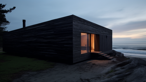 a cabin on the beach that looks like charred wood designed by Gilles Retsin --ar 16:9