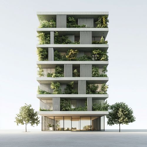 an isometric shot photo of a view of A 7-story longitudinal building with an open ground floor, approximately 120 meters long, standing alone on an empty plot of land. The architecture is minimalist, featuring a green façade with integrated vertical gardens. The design embodies the clean lines and refined simplicity of David Chipperfield’s architectural style, combined with parametric elements that create a dynamic and modern aesthetic. The setting is bright and spacious, highlighting the building’s innovative structure and sustainable features, realistic.