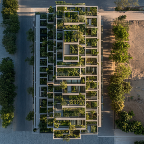 an aerial view of A 7-story longitudinal building with an open ground floor, approximately 120 meters long, standing alone on an empty plot of land. The architecture is minimalist, featuring a green façade with integrated vertical gardens. The design embodies the clean lines and refined simplicity of David Chipperfield’s architectural style, combined with parametric elements that create a dynamic and modern aesthetic. The setting is bright and spacious, highlighting the building’s innovative structure and sustainable features, realistic.
