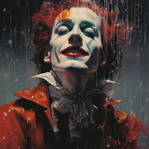 Image or poster with the drawing style of Drew Struzan. We are in the 50s. We see a man dressed as a circus clown, crying in the rain and at night. Visual style by Drew Struzan.