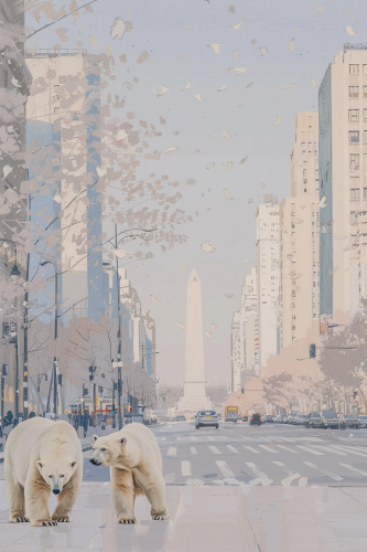 A photorealistic image of the obelisk of Buenos Aires, Corrientes Avenue, with three with polar bears in the middle of the street. Light pastel colors, ethereal light, a bit out of focus --ar 4:7 --sref 3840558885 --v 6.0 --s 250