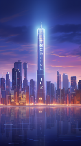 A modern skyscraper seen from afar with the word "Humility" written on it as white lights, “HUMILITY” humility “H U M I L I T Y” HuMILITy written in Arial, neon light, at night --v 5.2 --ar 9:16