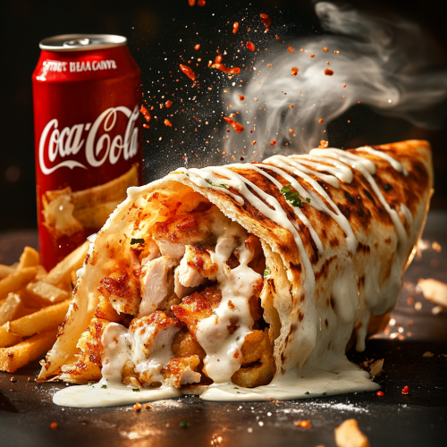 A very realistic side image of a thin, toasted Armenian saj bread. It contains pieces of chicken and fried potatoes with white sauce, so that part of the chicken pieces, fried potatoes and white sauce fly over the sandwich in the air, in an artistic advertising design, so that smoke rises from it, and the white sauce appears in a way An advertisement. Next to this sandwich is a box of french fries with ketchup sauce in an advertising manner, and next to them is a can of Coca-Cola that appears in an advertising manner.