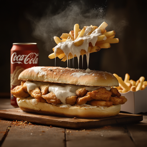 A very realistic side image of a French Tacos Galette armeniane like thin toasted Armenian, is cut in half,consisting of with chicken pieces and frites and white cheese sauce melted in an advertising manner,so that part of the chicken pieces, french fries and white sauce are flying in the air in an advertising design. Artistic, so that smoke rises from it, and the white sauce fromage melting appears in an advertising manner. Next to them is a box of french fries with ketchup sauce in an advertising manner, and next to them is a can of Coca-Cola that appears in an advertising manner.