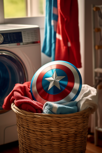 Dynamic shot of Captain America’s sock shield-bouncing towards a laundry basket, medium: hyper-realistic photography, style: action-packed Marvel scene with a humorous twist, lighting: indoor ambient with a spotlight on the sock, colors: patriotic red, white, and blue with a soft background, composition: Nikon D850, Nikkor 85mm f/1.4G lens, Resolution 45.7 megapixels, ISO sensitivity: 64, Shutter speed 1/200 second, sock in mid-air with laundry basket in the foreground --ar 2:3 --v 5.1 --style raw --s 750