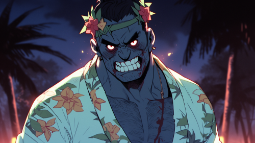 Create a portrait of an attractive, skilled Hawaiian paniolo in the late 19th century, capturing the dynamic action of roping cattle. The paniolo has a determined expression, with sun-kissed skin and strong, focused eyes. He wears a wide-brimmed cowboy hat, a bandana around his neck, and a traditional Hawaiian shirt with a unique, floral pattern under a leather vest. He's on horseback, amidst a rugged Big Island landscape with rolling hills and distant mountains. The horse, mid-gallop, shows a flowing mane, while a lasso whirls above the paniolo's head, just as it's about to encircle a steer. The scene is vibrant, full of motion, and rich in detail, embodying the spirit of the Hawaiian cowboy heritage. Cinematic, dramatic --ar 16:9 --v 6.0