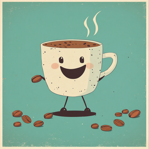 vintage cartoon of an anthropomorphic coffee cup character, coffee beans around him, muted pastel colors, vintage, 70s advertising poster, 2D flat design, simple shapes, 6 color only, no shadows, no gradient, no outlines, 4k, high resolution