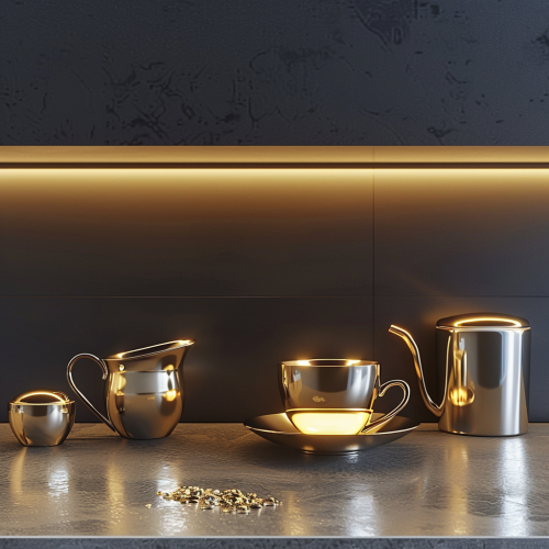 masterpiece cup of coffee; contemporary style; sugar bowl and creamer on counter; rim lighting; iridescent gold; minimalistic
