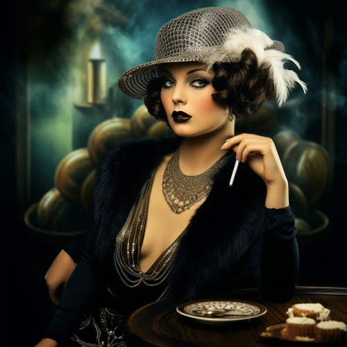 Create a high-resolution, realistic image featuring a beautiful woman in an Art Deco style setting. The background should be exclusively in black and silver colorations, embodying the elegance and sophistication of the Art Deco era. The woman, depicted with a striking and confident demeanor, should be smoking a cigarette. Her attire and appearance should reflect the opulence and artistic flair of the 1920s, with intricate detailing in her clothing and accessories. The overall composition should capture the essence of the Art Deco movement, characterized by its luxurious and geometric designs, while focusing on the graceful and stylish woman as the centerpiece of the image.