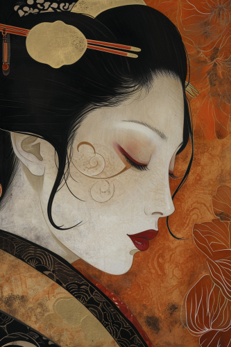 a beautiful kabuki woman , art deco, earthy colors --ar 4:6 --v 6.0 --style raw