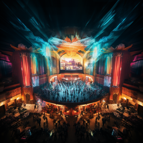art nouveau oil painting of a crowded grand art-deco museum filled with towering aqua tanks containing strange cerulean life-forms, interior architecture style is a mix of ornate gothic detailing and arcology-inspired lush green walls and art-deco influences, rainy night lighting dark and cool colors, old-master oil painting with fine brushstroke detail + in the style of rembrandt --ar 16:9