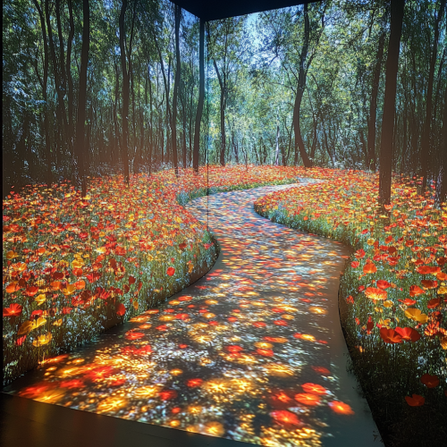 A photo of a video screen displaying a sunny nature trail, flowing music notes in the sunshine, the trail is lined with tiny red and yellow flowers, in the style of TrYYY augmented reality. --s 750