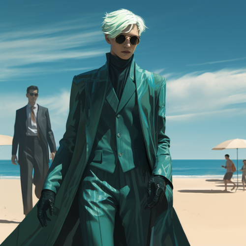 SUBJECT: a casual stroll on the beach but set in the Matrix | STYLE: art book style, shiny green and cyan, art deco, medieval, strong emotions, expressive, hellish background, decopunk