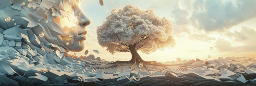 art deco sculptural tree with roots growing along a faceted landscape. The canopy of the tree is large and spreads across the sky. The tree leaves are made of glass jigsaw puzzle pieces The tree is superimposed inside a human head --ar 3:1