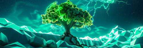 photoreal ultrawide art deco sculptural tree with roots growing along a faceted flat vector papercraft landscape with neon green highlights. The canopy of the tree is large and spreads across the sky. The leaves are made of lightbulbs --ar 3:1