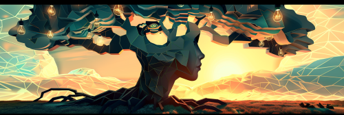 art deco sculptural tree with roots growing along a faceted flat vector papercraft landscape. The canopy of the tree is large and spreads across the sky. The leaves are made of lightbulbs. The tree is superimposed inside a human head --ar 3:1
