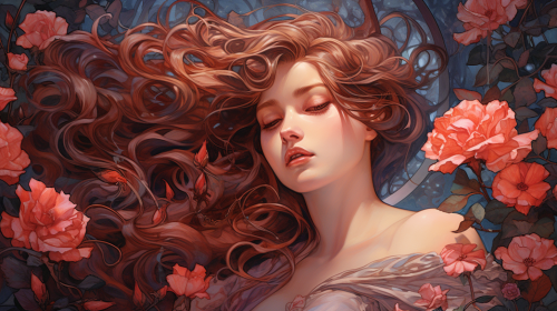 BEAUTIFUL GIRL, nightingale and roses, in the Art Nouveau style --ar 16:9