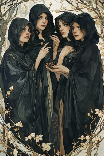 Stength Tarot card, Ethereal Vision, in the style of Art Nouveau, Alfons Mucha, Jean Delville, Black hooded cloaks, beautiful, languid, dreamy look, four women standing together, couldron, witchcraft --ar 2:3 --v 6.0