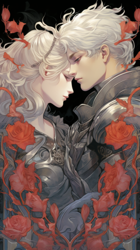 Two knights twins one female one male sliver hair back to back, in the style of art nouveau-inspired illustrations, baroque-influenced drama, loish, light red and dark gray, dragon art, tarot card, alphonse mucha, --ar 9:16 --v 5.2