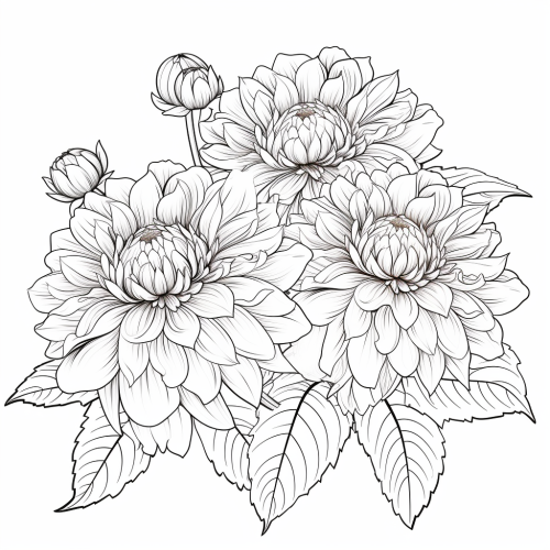 coloring page for adults, globe dahlias on full length stems in the style of Rosalind Wheeler botanical drawings, white background, NO SHADING, clean line art, closed lines, HD vector