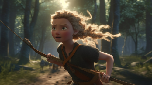 A strong and graceful Forest Ranger with long, flowing dark hair tied back in a practical yet elegant braid, and expressive green eyes that radiate confidence and a deep connection with nature. Her skin is sun-kissed, and she wears earthy-toned, realistic leather armor with intricate leaf and vine patterns. She carries a finely crafted bow and quiver of arrows, with a calm, focused expression. She has a gentle, harmonious connection with the animals around her, communicating with them as they move beside her. In a semi-realistic Pixar style, with lifelike textures, detailed natural clothing, and dynamic forest surroundings filled with lush greenery and wildlife. --ar 9:16
