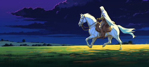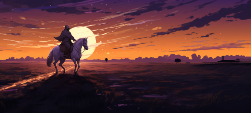 The Middle Ages, a man in a white hooded cloak riding fast on his horse in a open field, the man holding a artifact under his arm, a mixed style between Mœbius and old GTA video games pause screen style, yellow and purple lights, simple drawing, few colours, late evening, --ar 20:9