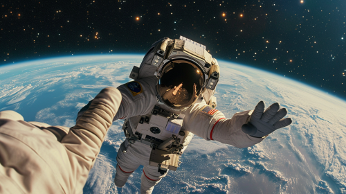 Hand of an astronaut floating in space, reaching out to the stars, pov shot from astronaut --v 6.0 --ar 16:9