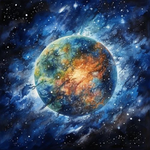 intense watercolor painting of a computronium version of the Earth, entire planet has turned into computronium, outer space background with glittering stars
