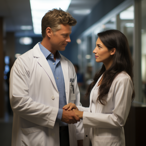 stock photo, photorealism, man and woman looking at each other shaking hands, clear facial features, medical professional clothing, medical office background, 50mm lens, f/1.8, waist level, uplight, kodachrome, bright artificial light --s 750