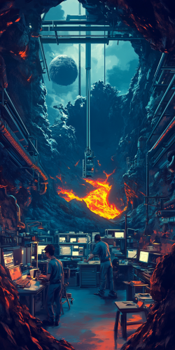 interior of an enormous laboratory of geosciences where students and professors work together with every king of tools, with natural elements and artificial one. Realistic, bright, science, Naples, university, science, geology, sea, space, volcano. --ar 1:2