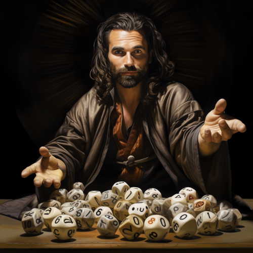 Mat Cauthon holding the Ashandarei and throwing the dice, photorealistic