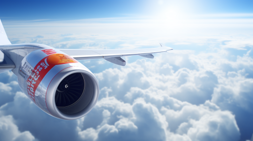 visualize a billboard advertisement of a beer can sat upon the wing of an airplane. The beer can is white and blue. It radiates class and lightness. Above the beer can are bright red letters that indicate the brand name. Taken with a nikon z9 50 mm f2.8 --ar 16:9