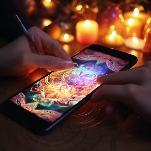Close-up view of a smartphone that records a ceremony with candles and mandala, hands holding the phone with a distance, 2D, medium shot, natural and pastoral colors, pen drawing with acrylic painting style, square, Natural Light in a mystical area, 4k, eye - level