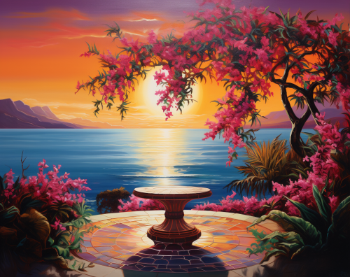 in baroque style mixed with art deco, an extremely vibrant and artistic piece of a giant multi-colored Bougainvillea tree that's planted in a giant circular pot, in front of a backdrop of the ocean and setting sun, --ar 14:11