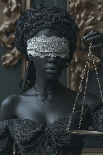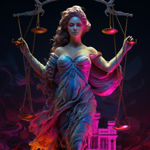 Lady justice, synthwave, full frame, match the Roman goddess of justice and law, justitia with colorful art layered over her skin. She is painted in the style of ink, 4k, 8000 pixel, hypermaximalist, elegant, hyper realistic, super detailed, photography